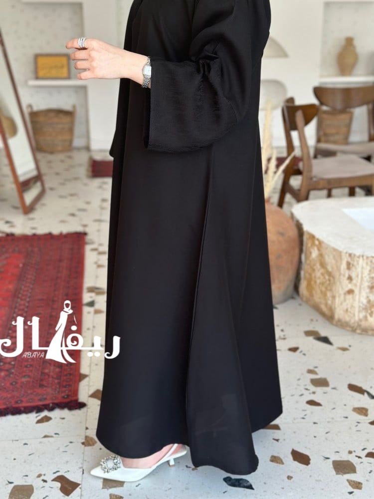 - وصف الموديل: عباية اريج صنعت من خامة المار توفرت باللون الاسود تتميز بوجود قماش خيال علي الكم