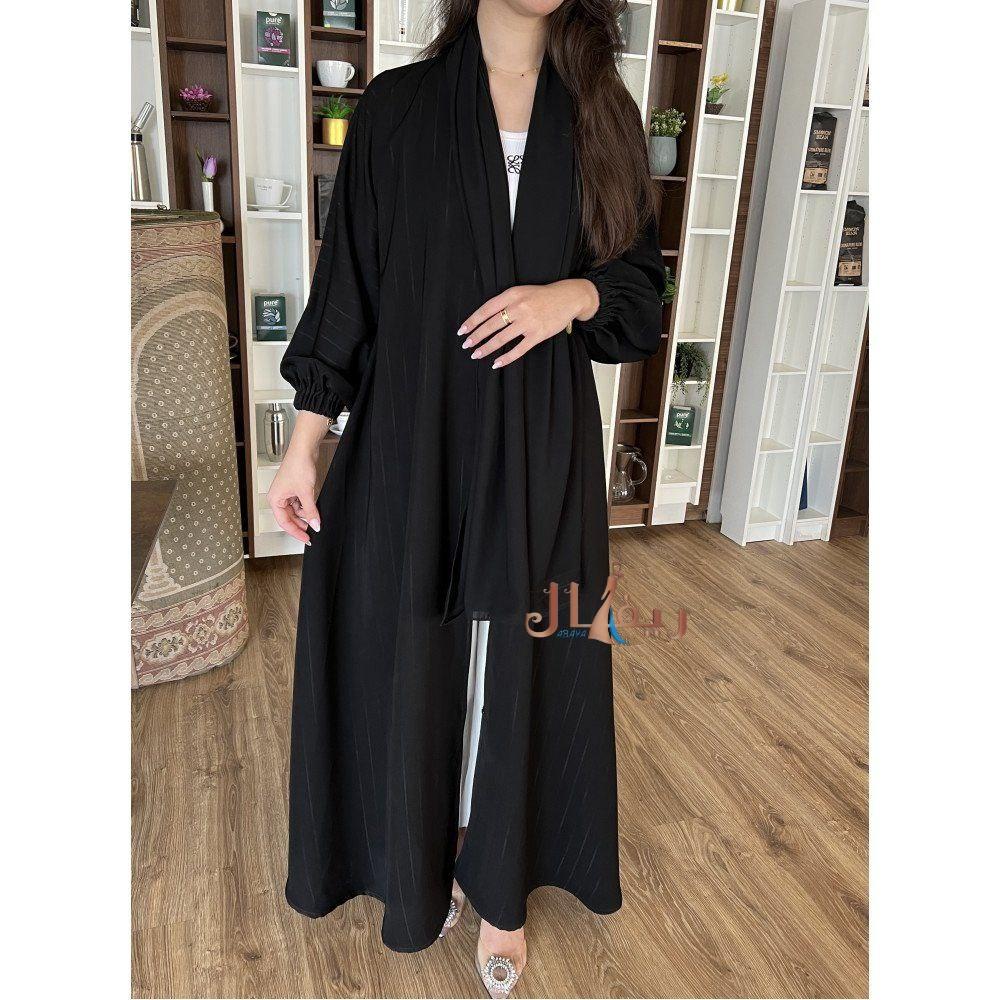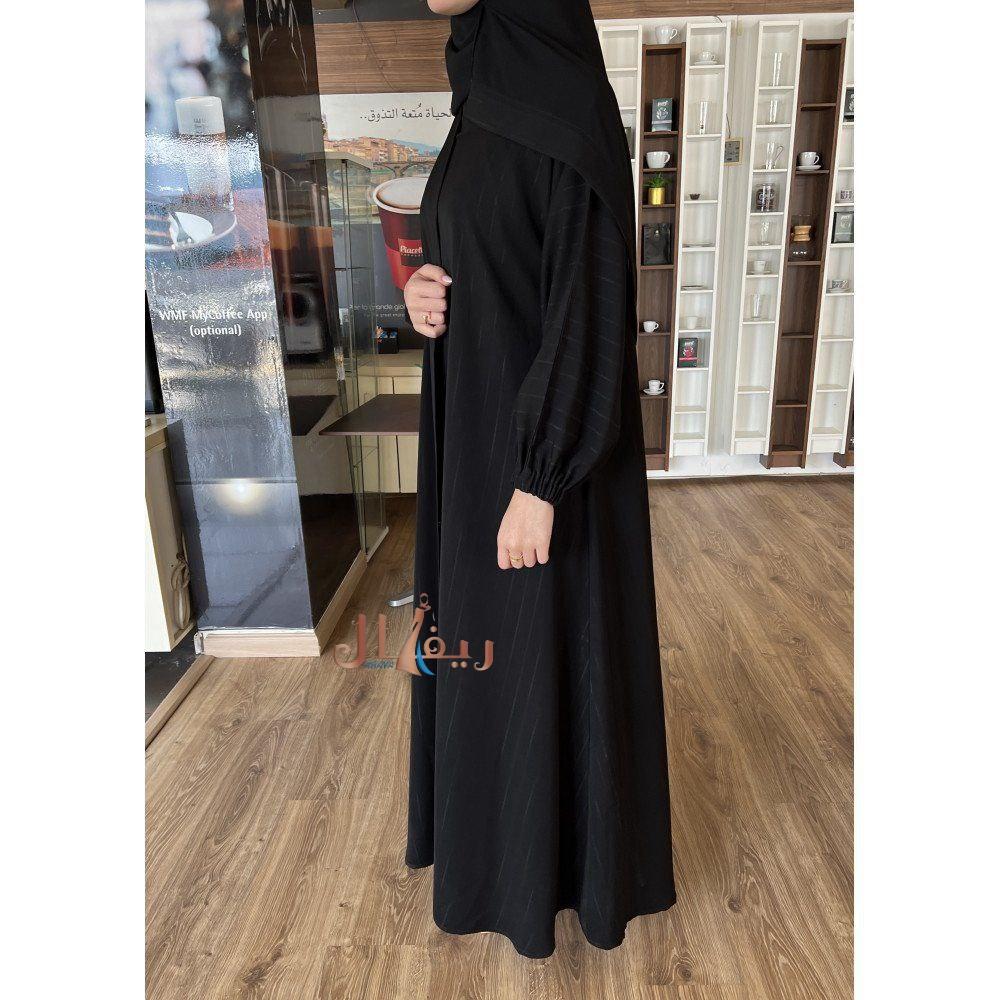 - توفرت عبايات مقلمة في متجر ريفال باللون الاسود المميز، وجاء تطريز هذه العباية مختلف فهي عبارة عن تصميم مقلم وكم مزموم