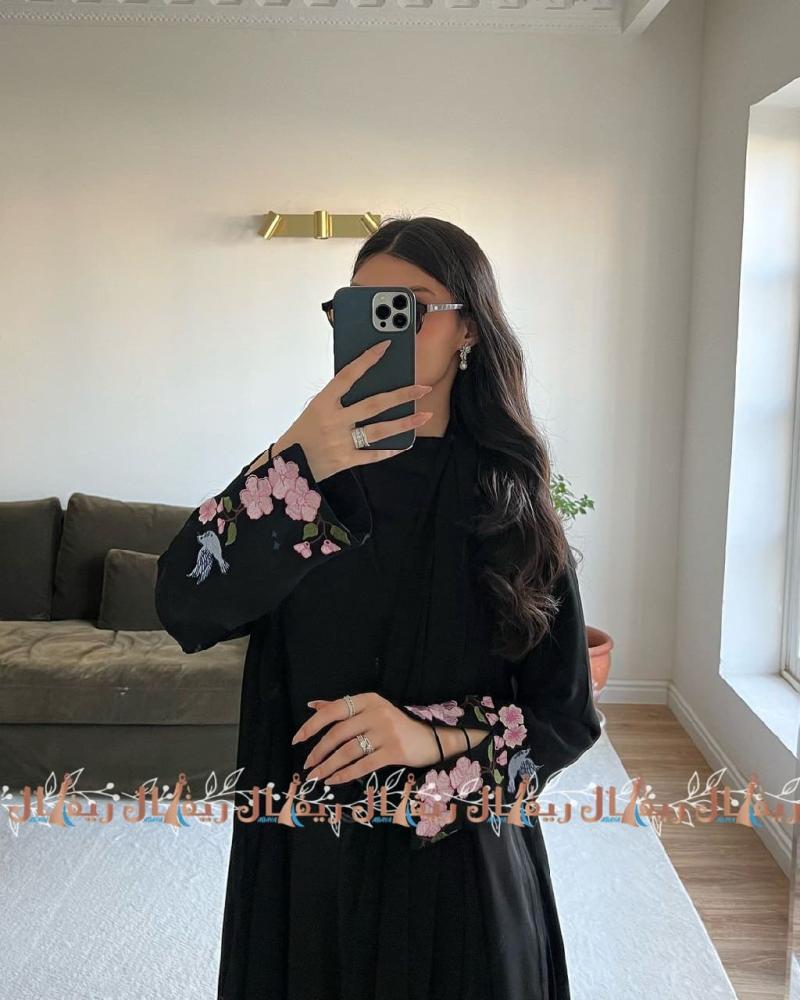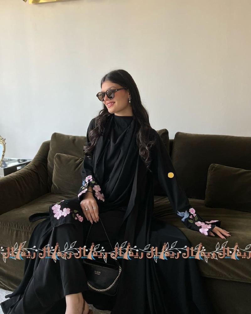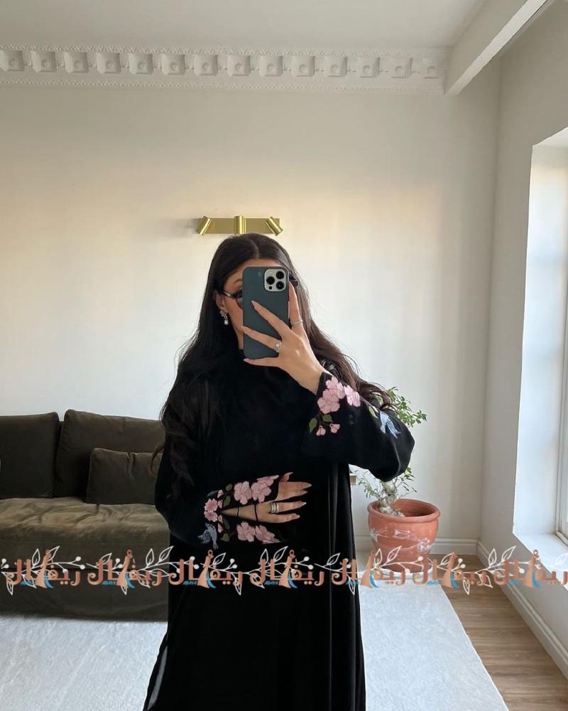 "أنوثة ناعمة مع عباية موده ورود، تصميم أنيق مزدان بلمسة زهرية تمنحك جمالًا وفخامة في إطلالتك."