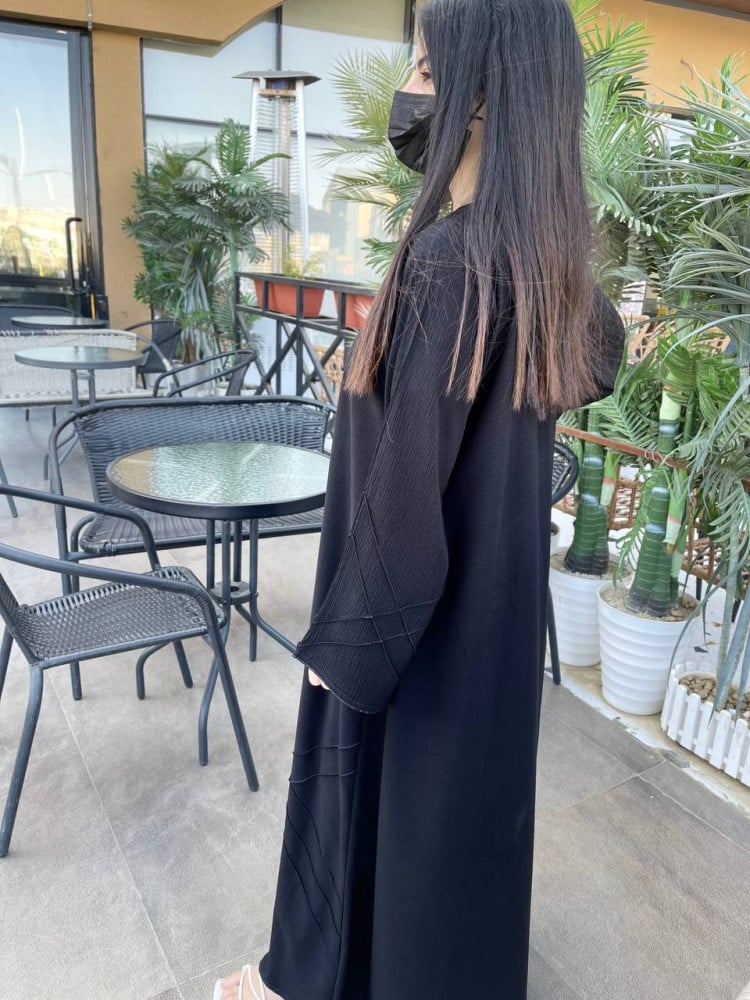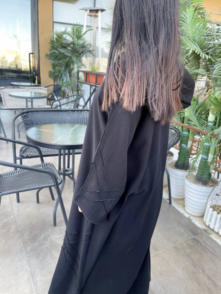 - تتميز العباية نص كلوش بوجود تخطيط هندسي على الكم وأسفل العباية؛ يعطيكي إطلالة ساحرة وعصرية.